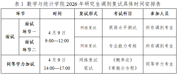 我院网络远程复试包含线上面试、线上笔试(同等学力加试)等环节,具体复试安排见下表1。