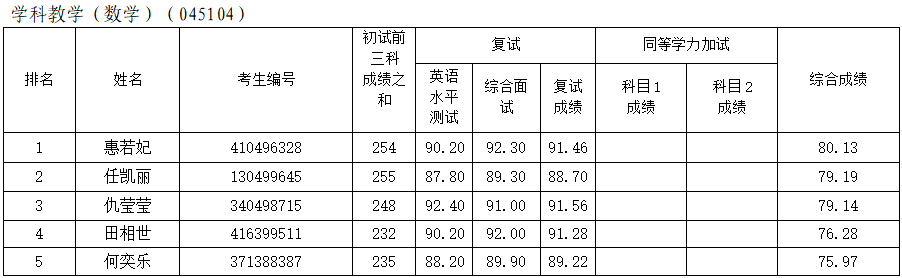 按照我校2026年研究生招生工作安排,我院于4月9日进行了调剂第一批次复试,现对考生复试综合成绩进行公示: