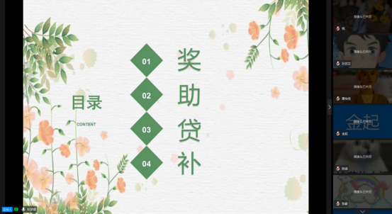 为积极响应国家和学校号召,切实保证各类各项资助政策落到实处,解决家庭经济困难学生的后顾之忧,9月15日上午,我院通过视频会议的形式召开资助政策线上宣讲课,由辅导员耿梦媛老师主讲,新生辅导员张悦老师、徐元杰老师、新生代班以及全体2021级新生参加。