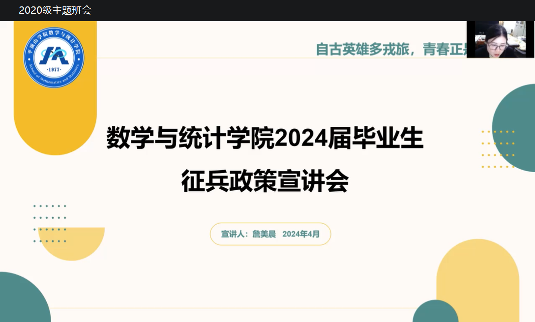 为积极响应国家号召,切实做好我院大学生征兵工作,充分激发学生们的爱国情怀,鼓励更多学生积极应征入伍,4月30日,太阳集团tyc539MACAU于线上召开了2024届毕业生征兵政策宣讲会,由毕业班辅导员詹美晨主讲,2024届全体毕业生参加。