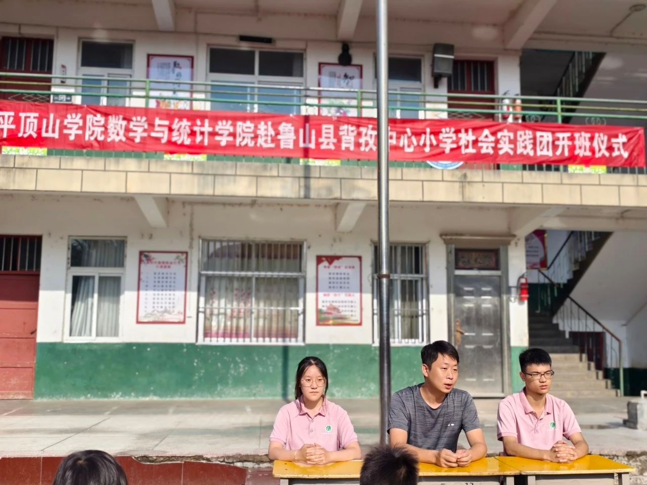 7月4日,太阳集团tyc539MACAU“相遇仲夏·携手助学”社会实践团在鲁山县背孜中心小学举行开班仪式,服务团带队老师李睿智、全体志愿者以及七十余名学生和家长代表参加,仪式由服务团团长马旭冰主持。