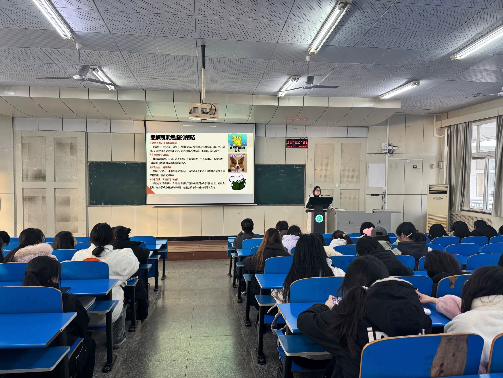 讲座上,詹老师通过深入浅出的讲解,向同学们分析了考试焦虑产生的原因,并强调适度压力有助于提高同学们的注意力和反应速度,是应对考试的一种动力。但过度焦虑可能会对学习和生活产生不良影响。针对学生们遇到的问题,詹老师从“ 调整心态,正确看待成绩”、“合理规划复习时间”、“劳逸结合,适时放松”、“寻求帮助、专业指导与支持”四个方面向同学们讲解了应对考前焦虑的策略,她希望同学们制定详细的学习计划,将大目标分解为小目标,以积极的心态去面对,用正确的方法去应对,争取在期末考试取得理想的成绩。