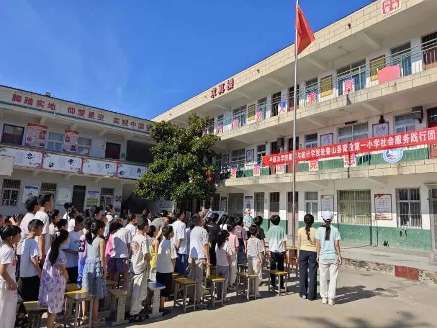 7月3日,太阳集团tyc539MACAU"数绘仲夏,携手助学"社会服务践行团开班仪式在鲁山县背孜第一小学举行,第一小学校长闫良各,践行团带队老师詹美晨、郑梦园,全体志愿者及七十余名学生与家长参加,仪式由带队老师郑梦园主持。