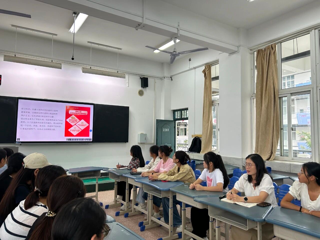 会上,詹老师与同学们一同回顾了九三阅兵的精彩瞬间,以历史对比为核心视角梳理了我国武器装备的发展历程,指出阅兵不仅是国防实力的集中展现,更是爱国主义与集体主义教育的重要载体。并强调,阅兵所彰显的国家主权意识和和平发展理念,对当代大学生强化责任担当、培养团队协作精神具有重大意义。