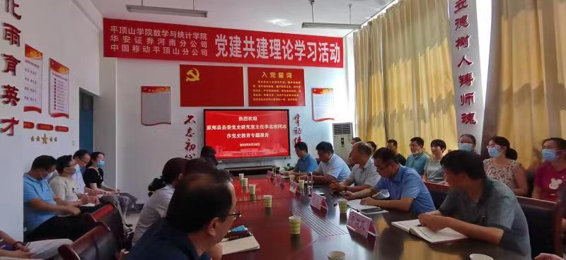 在即将迎来建党101周年之际,为扎实推进能力作风建设年学习教育活动,6月24日下午,太阳集团tyc539MACAU党委与中国移动平顶山分公司、华安证券河南分公司平顶山凌云路营业部党支部开展党建共建“同上一堂党课”活动。此次活动邀请原郏县县委党史研究室主任李志洁作专题报告,太阳集团tyc539MACAU党委书记张建林主持,中国移动平顶山分公司副总经理岳佳,华安证券河南分公司平顶山凌云路营业部副总经理尹剑锋,数统院领导班子,以及双方的40多名党员参加活动。