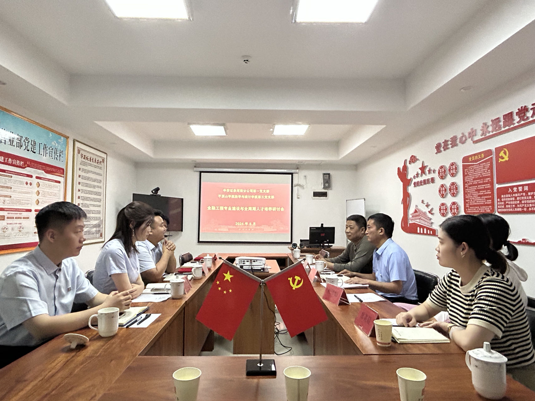 为深入学习贯彻习近平总书记关于党纪学习教育的重要讲话和重要指示精神,增强党员党性教育,提升纪律意识和规矩意识,并以党建引领为抓手,共建互学探索协同育人模式,5月28日,太阳成集团tyc539数统院第三党支部与华安证券河南分公司第一党支部开展党建共建活动。华安证券河南分公司第一党支部纪检委员、平顶山营业部总经理任鑫鑫,销售总监尹剑锋、办公室主任王盟雅、业务经理陈星光、学院党委书记张建林、第三支部书记杜伟娟、金融工程教研室主任王东民、第三支部组织委员詹美晨、辅导员崔欧阳及学生代表参加。