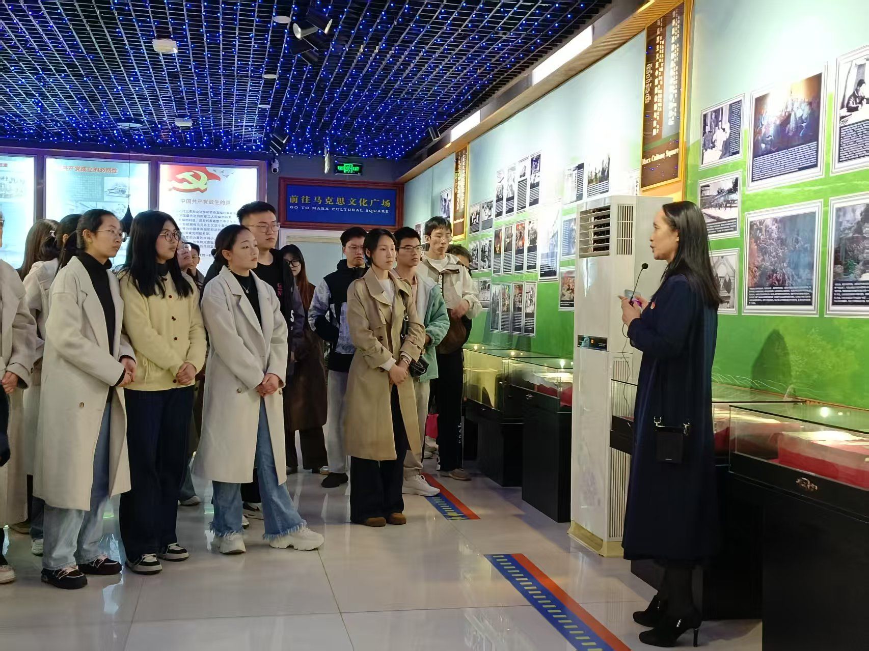 活动中,在讲解员的带领下,大家有序参观了“国际工人运动与马克思主义的产生”、“马克思主义在中国的传播与实践”等展区。馆内珍藏的大量历史文献、珍贵照片和实物展品,生动展现了马克思主义从诞生到发展的光辉历程,以及在中国革命、建设和改革中的伟大实践。参观过程中,同学们认真聆听并参与抢答,积极与讲解员互动。