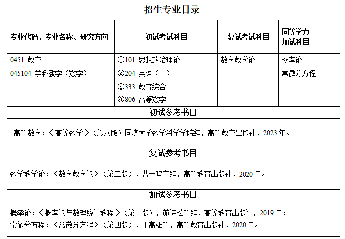 根据国家及学校相关政策,现将我院2026年学科教学(数学)硕士研究生专业的招生考试科目及参考书目公告如下: