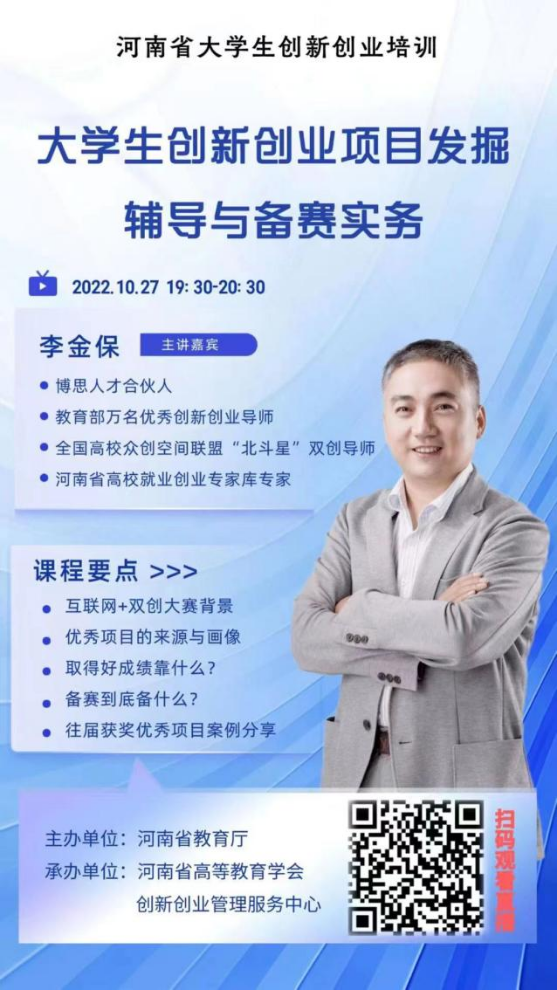 为贯彻落实《河南省进一步支持大学生创新创业的若干措施》,培养大学生自主创新意识及创业能力,进一步加强我院师生参与创新创业大赛的积极性。10月27日晚,太阳集团tyc539MACAU组织师生共同观看了河南省教育厅大学生创新创业系列培训讲座第一讲,本次讲座由李金保老师主讲。
