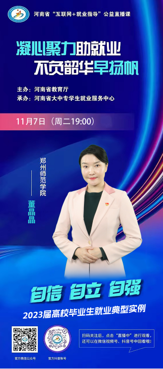 为落实党中央、国务院“稳就业”“保就业”的决策部署,我院于11月7日组织2023届毕业生观看学习河南省“互联网+就业指导”公益直播课,旨在做好毕业生就业创业工作,积极拓展“就业+互联网”新模式,确保“凝心聚力助就业、不负韶华早扬帆”。此次课程由郑州师范学院董晶晶主讲。