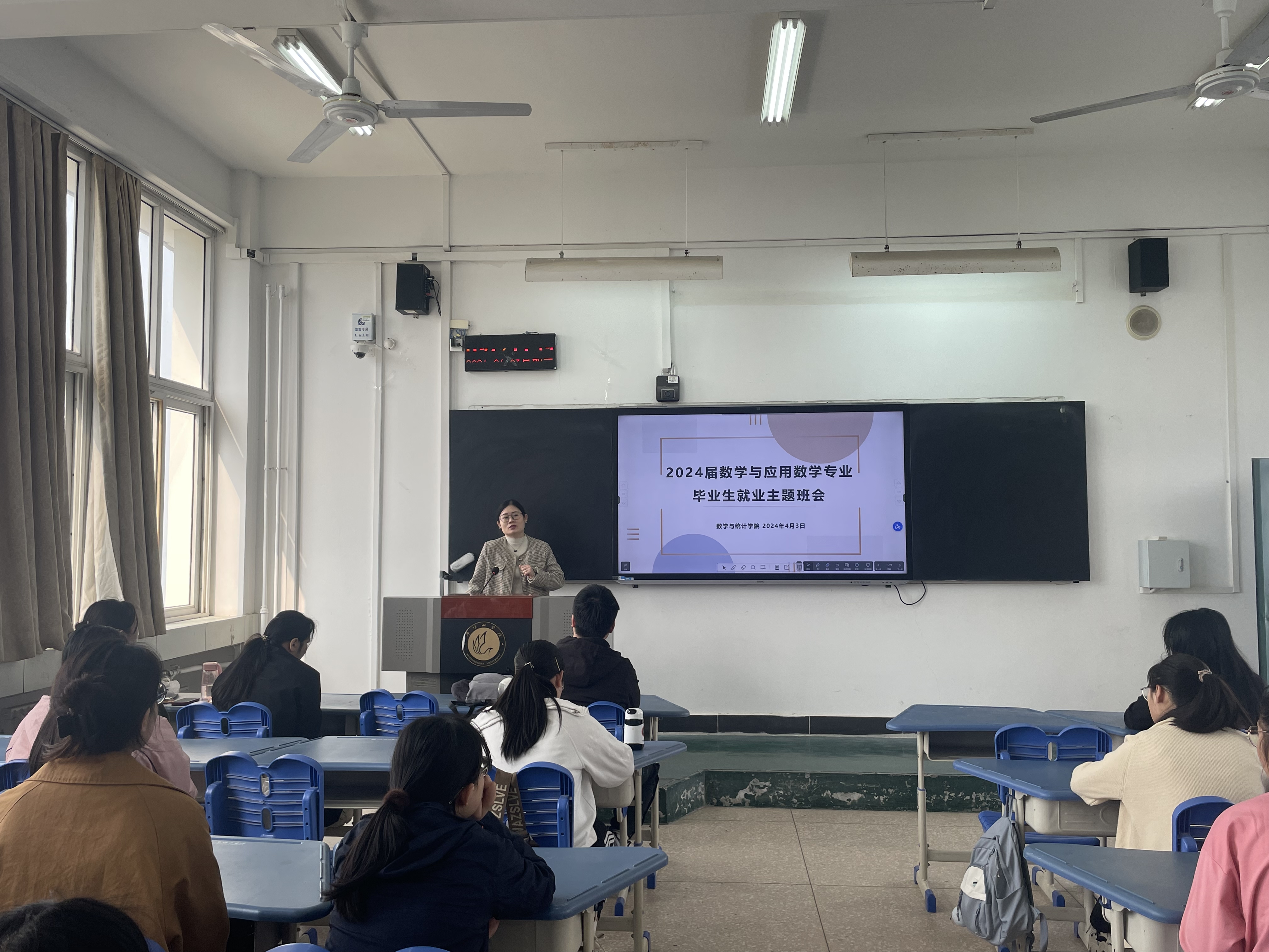 为进一步推进2024届毕业生就业工作,做好当前就业形势的分析和研判,帮助毕业生实现更高质量和更加充分就业,3月27日,学院副院长王俊俊召开数学与应用数学专业毕业生就业主题班会,会议由毕业班辅导员詹美晨主持。
