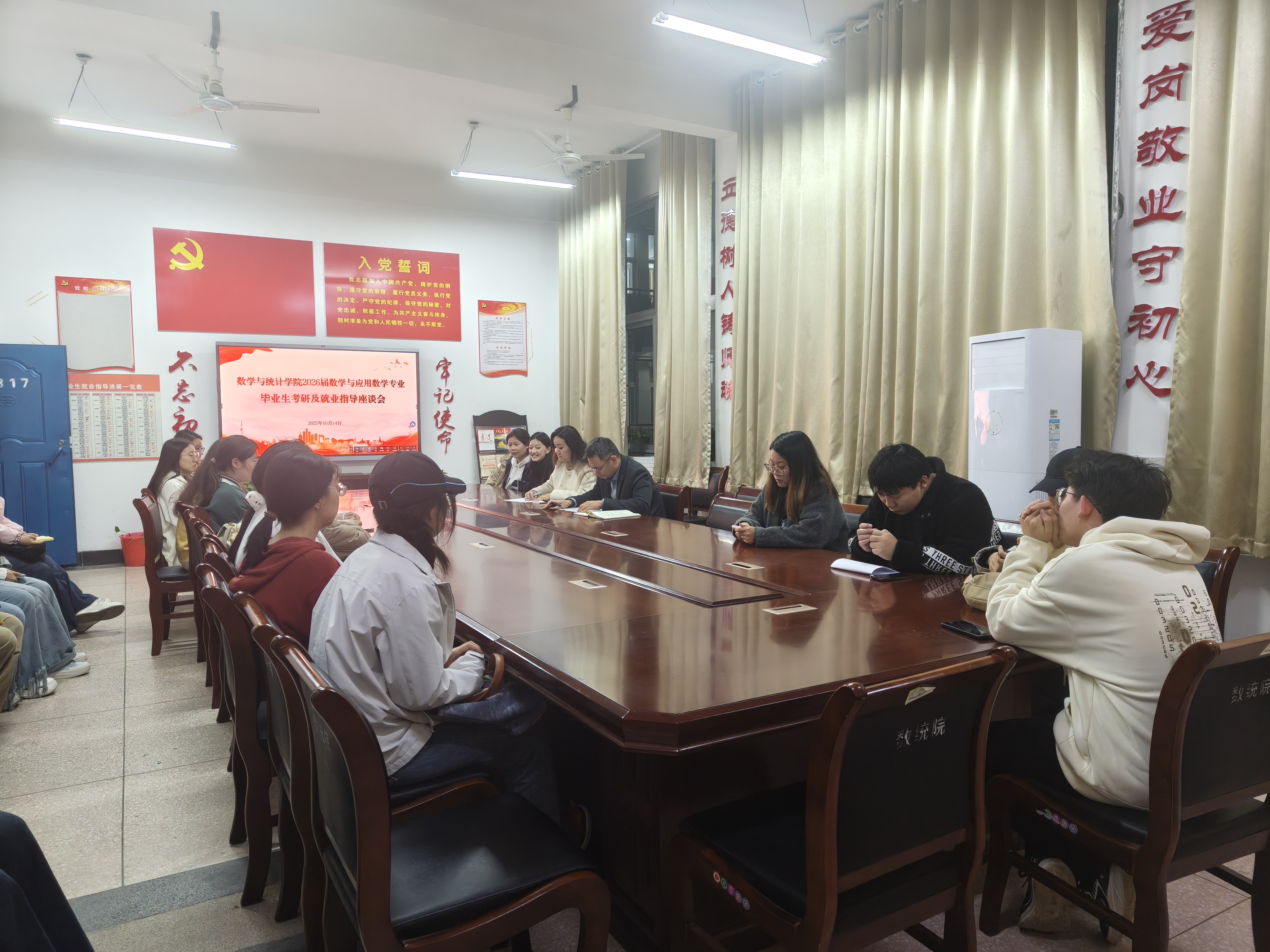 为切实做好2026届毕业生考研与就业指导工作,帮助同学们明确发展方向、解决升学就业困惑,太阳集团tyc539MACAU于2025年10月14日晚上在2317会议室召开2026届数学与应用数学专业毕业生考研及就业指导座谈会。学院副院长严磊、毕业班辅导员耿梦媛主持会议,2026届数学与应用数学专业部分毕业生代表参加了此次座谈会。