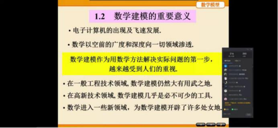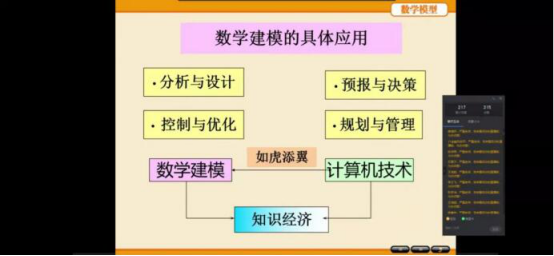 讲座伊始,严老师从数学建模的概念开始讲起,用生动形象的例子深入浅出地为同学们介绍了什么是数学建模及现实生活与数学建模之间的联系,并通过“商人过河”的问题引导同学们全方位、多角度思考,让同学们更容易理解数学模型和数学建模。紧接着,严老师通过线上互动的方式,把真正适合学生的建模方法和自身积累的宝贵经验分享给同学们,鼓励同学们积极学习并深入探索数学建模知识,开拓自己解决问题的思路与方法。然后,严老师还向我们说明了数学建模的模型具有逼真性、可行性、渐进性、强健性和可转移性等特点,指出数学建模的过程是一个创新的过程,在思维方式上与其他课程存在较大差别,并介绍了类比、发散、归纳、猜测等思考问题的方式,尤其指出发散思维的重要性。讲座最后,严老师鼓励同学们积极参加数学建模大赛,把所学知识运用于社会实践中来分析、解决问题。