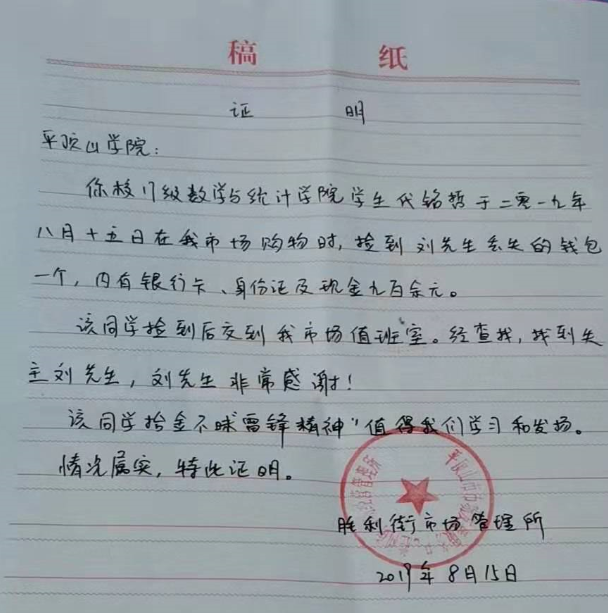 2019年8月15日,我院17级数学与应用数学1班学生代铭哲在平顶山市胜利街市场购物时,捡到一个钱包,内有银行卡、身份证及现金九百余元。代铭哲同学立即将钱包交到市场值班室,工作人员经查找与失主刘先生取得联系,归还了钱包。刘先生对代铭哲同学表示感谢,并对她高尚的道德品质表示赞扬。