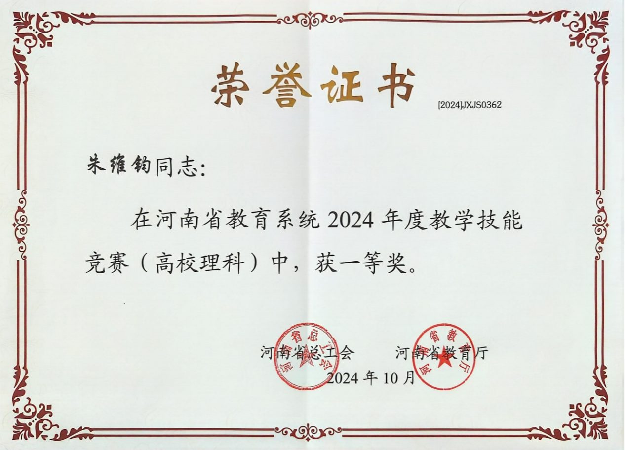 近日,河南省总工会与河南省教育厅共同主办的2024年河南省教学技能竞赛圆满落幕,经过初赛、决赛等环节,我院朱维钧老师从众多参赛教师中脱颖而出,获得高校理科组一等奖,并被授予“河南省教学标兵”荣誉称号,展现了良好的专业素养和较高的教学技能水平。